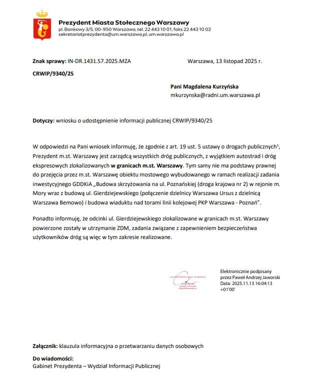Nie wiedząc, co zrobić w zderzeniu z takim urzędniczym betonem 11 lutego 2025 roku uznałem, że trzeba opisać całą sprawę i wysłać do Prezydenta Warszawy, Starosty Powiatu i Wojewody Mazowieckiego z krótkim wnioskiem – zmieńcie granice administracyjne, żeby ten piekielny wiadukt był w całości w Warszawie.Odpowiedź nadeszła póki co tylko z jednej strony.