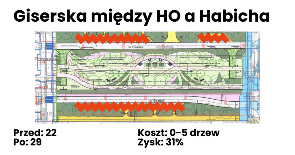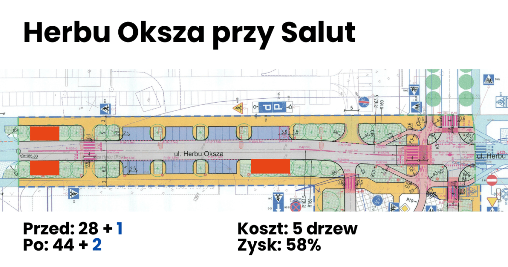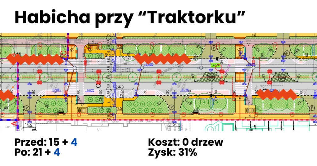 Jak widać da się wygospodarować więcej miejsc. Jest to fizycznie i prawnie możliwe. Jest z tego nawet całkiem przyzwoity uzysk, od 31 do 58% dodatkowych miejsc. Niektórzy sugerują, że na Habicha w okolicy Kompanii AK “Goplana” dałoby się wytyczyć miejsca w drugim rzędzie. Tyle, że tamtędy przebiega droga pożarowa. Jak chcecie skłonić urzędników do zmiany jej w miejsca parkingowe? Jak zdobędziecie na to pozytywną opinię Straży Pożarnej? Osobiście mogę tylko życzyć powodzenia.