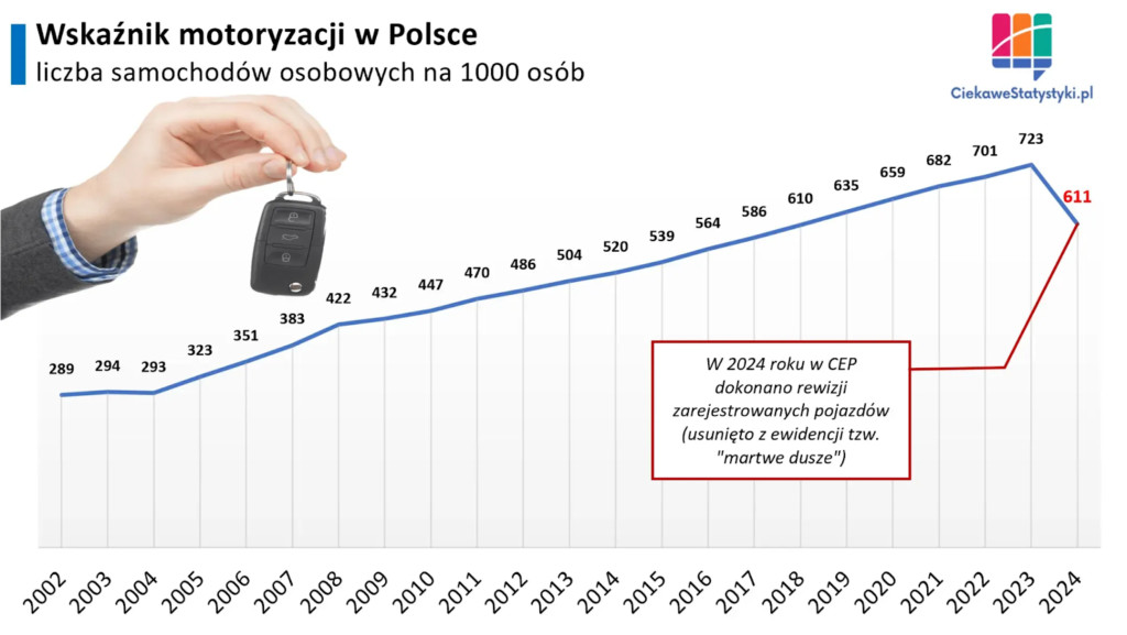 Do tego wskaźnik motoryzacji stale rośnie. Nawet po rewizji CEPiKU pod kątem “martwych dusz” (czyli dawno zezłomowanych albo wyeksportowanych samochodów) widać, że aut jest ponad 2x więcej niż w 2004 roku. Niezależnie od tego czy są to auta flotowe, leasingowe czy prywatne – zajmują one fizycznie miejsce przy ulicach lub w garażach.