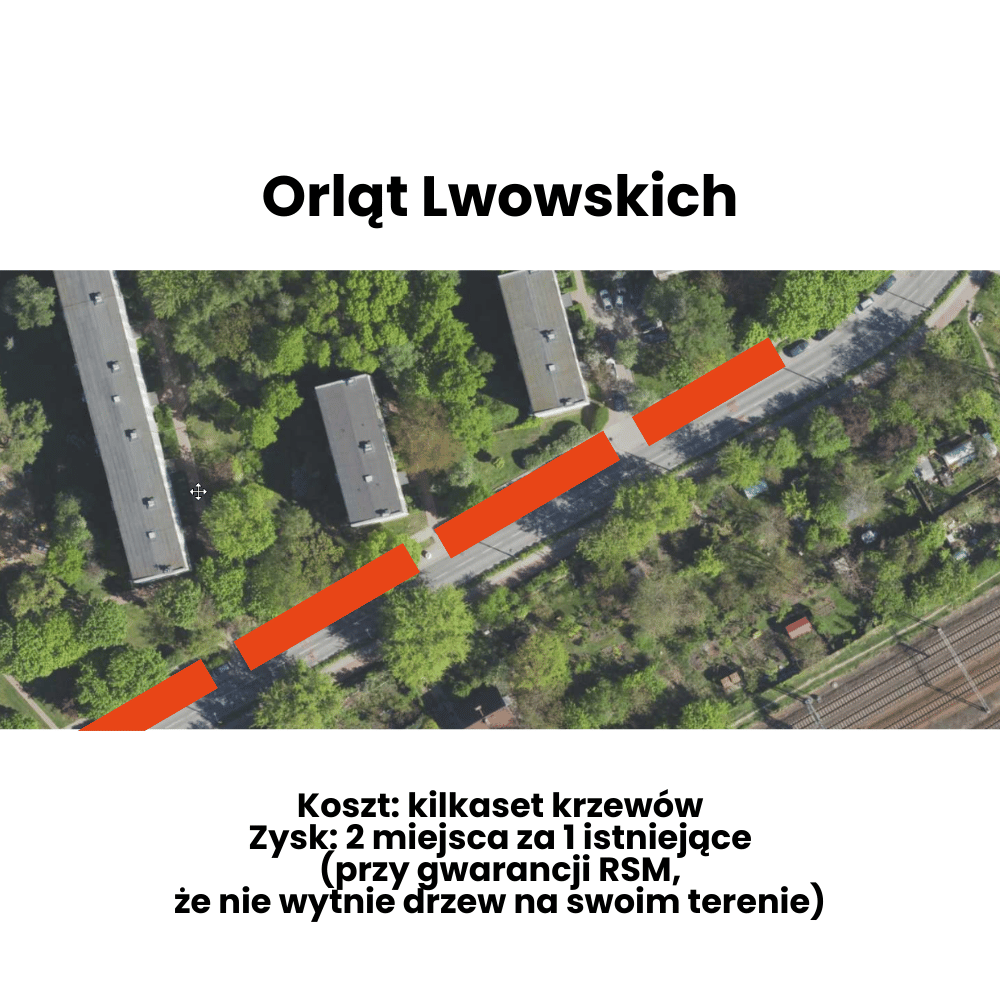 Przykładem może być chociażby ul. Orląt Lwowskich, gdzie można by wytyczyć kilkadziesiąt miejsc kosztem wycięcia krzewów. Oczywiście żal mi tej zieleni, ale dużo bardziej będzie mi żal drzew na terenie RSMu, jeżeli spółdzielcy postanowią wyciąć je pod parkingi.
